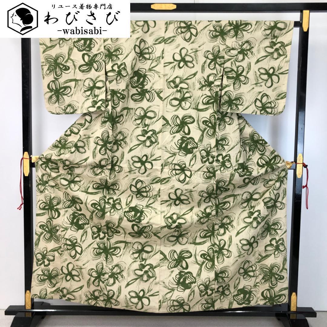 鳥の子色のお色味に抽象花模様の柄裄がデザインされた素敵なお品でございます。