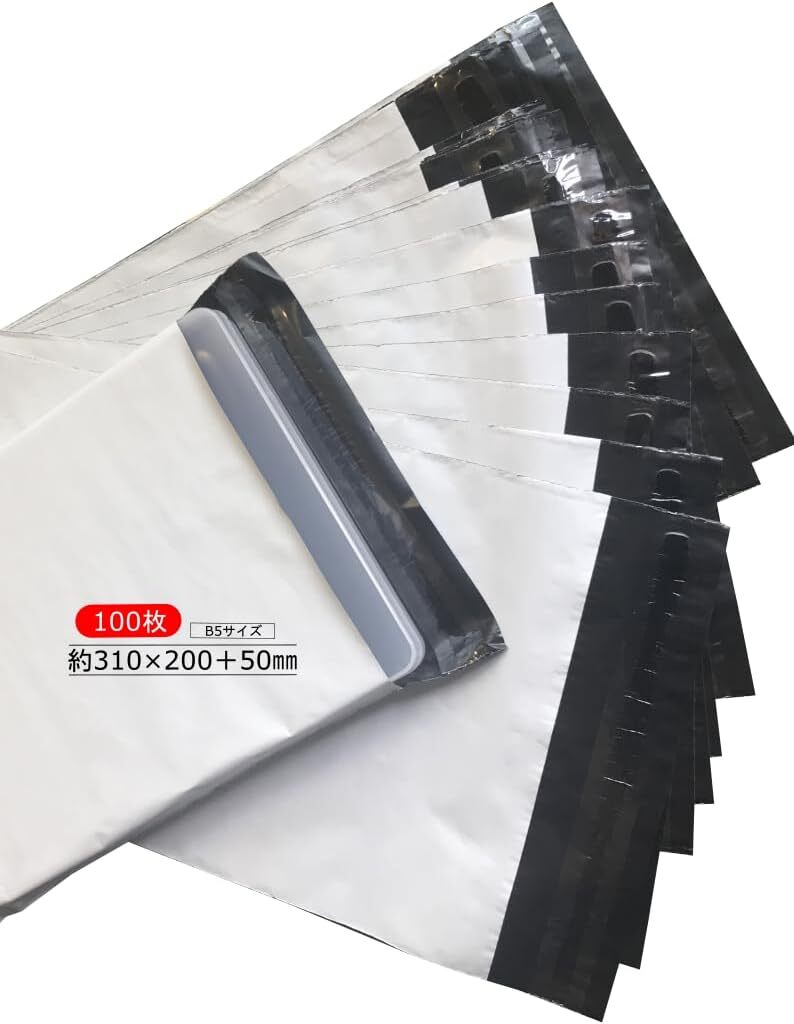 - 宅配ビニール袋 B5サイズ【100枚】幅200mm×深さ310mm+フタ50mm(100枚入) 梱包 防水 耐久 透けない 強力テープ フリマ 発送用 梱包資材