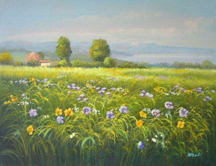 - ヨーロッパ絵画 肉筆油絵 (額縁付きで納品対応可) サイズF6号 バスコ作 「花畑」