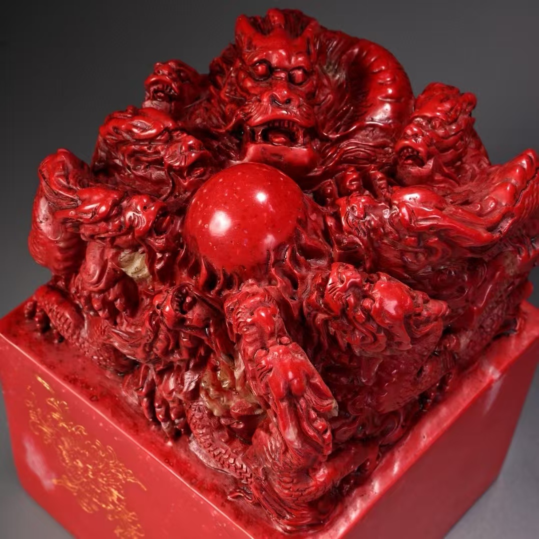 - 秘藏 清代 極品鶏血石彫刻大紅衣級九龍玉璽印 印章 印鑒 書道具 文房具 唐物 古玉彫 天然石 稀少珍品 古美術 古賞物 置物 旧蔵 玉佩6.6