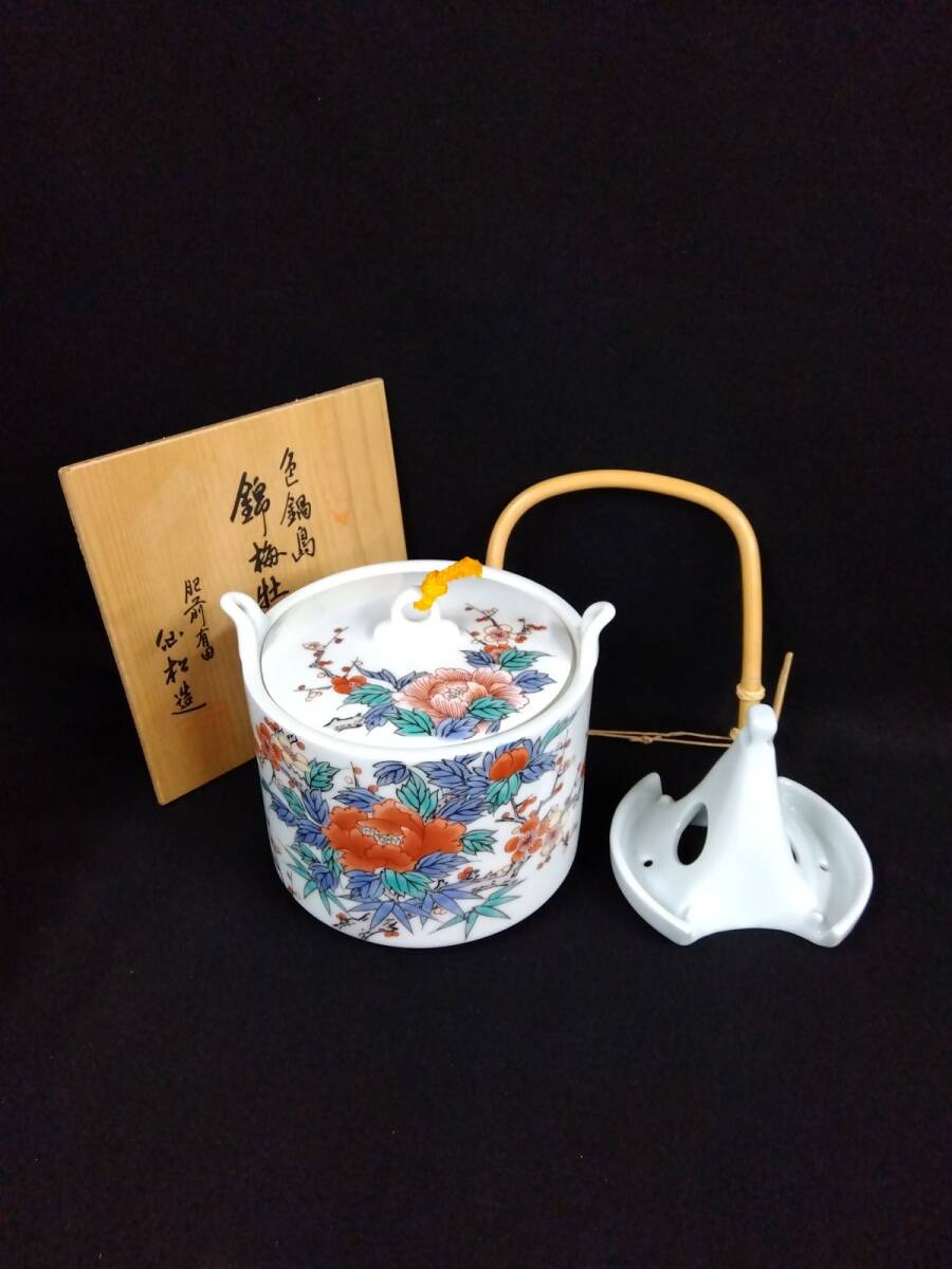 > R876 肥前有田焼 仙松造 はがくれ 色鍋島錦梅牡丹文 入れ歯洗浄収納器/80
