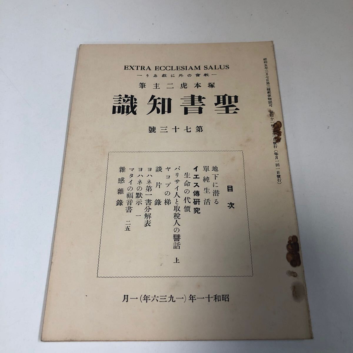 - M5i-025 聖書知識 塚本虎二 第七十三號 昭和10年 昭和初期 1935年 イエスキリスト キリスト教 73号