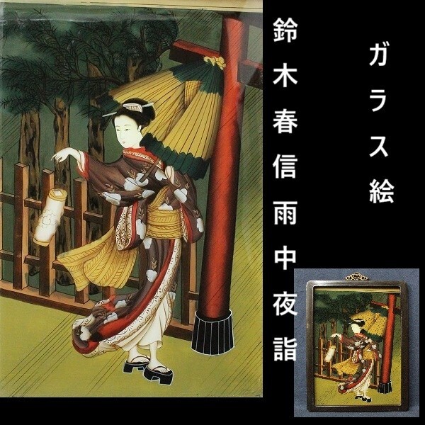 - 【模写】 ガラス絵の浮世絵 「鈴木春信 雨中夜詣 写し」 美人画 アンティーク額装入 時代物 D910