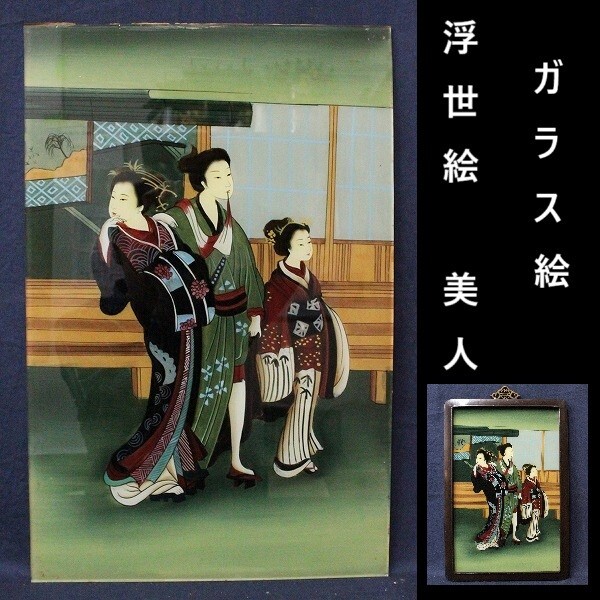 - ガラス絵の浮世絵 美人画 肉筆 アンティーク額装入 時代物 D909