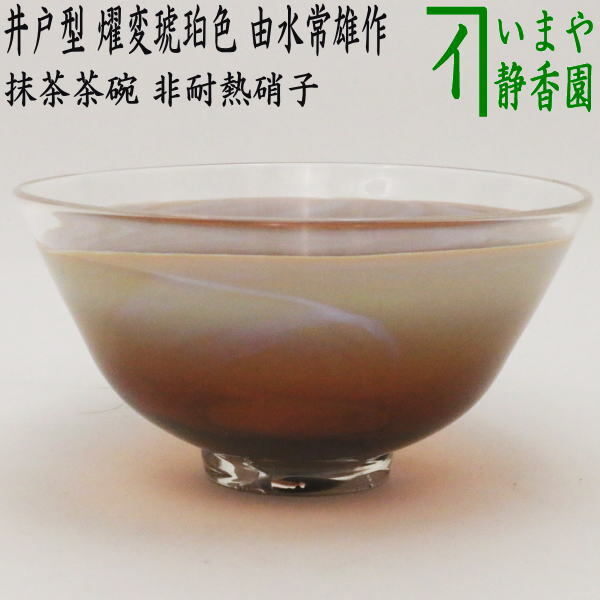 - 茶道具 ガラス抹茶茶碗 硝子抹茶茶碗 硝子 ガラス 義山 ギヤマン 井戸型 燿変琥珀色 由水常雄作 非耐熱硝子 茶道