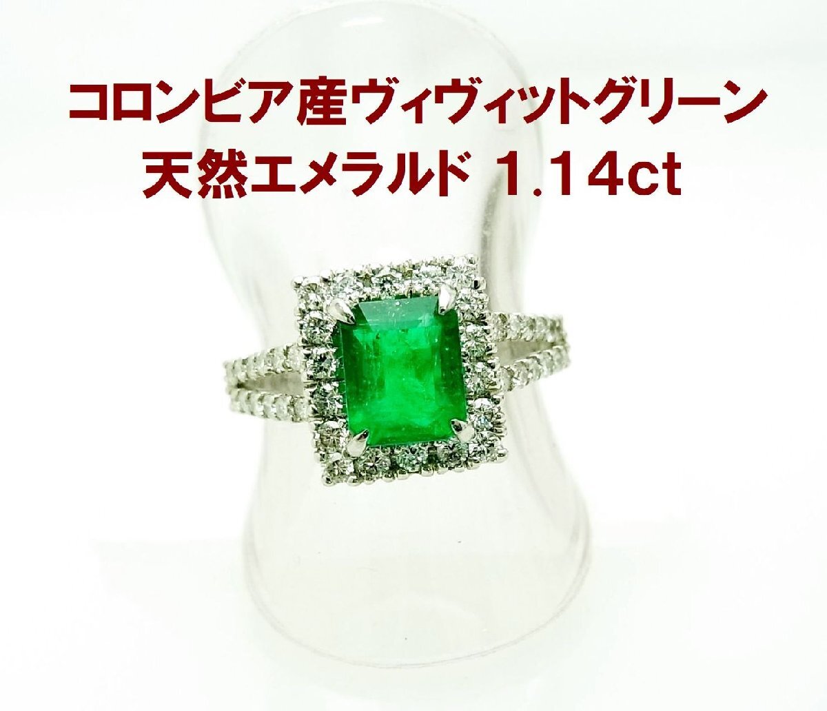 - コロンビア産ヴィヴィットグリーン鑑別付 天然エメラルド1.14ct ダイヤ取巻プラチナリング 卸価格 商品動画 送料込