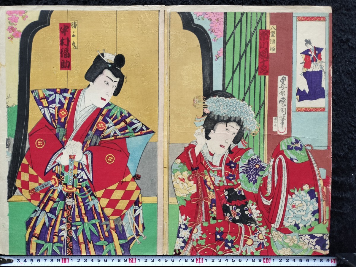 - 【真作】本物浮世絵木版画 豊原国周「中村福助」明治期 役者絵 錦絵 大判 二枚続 保存良い