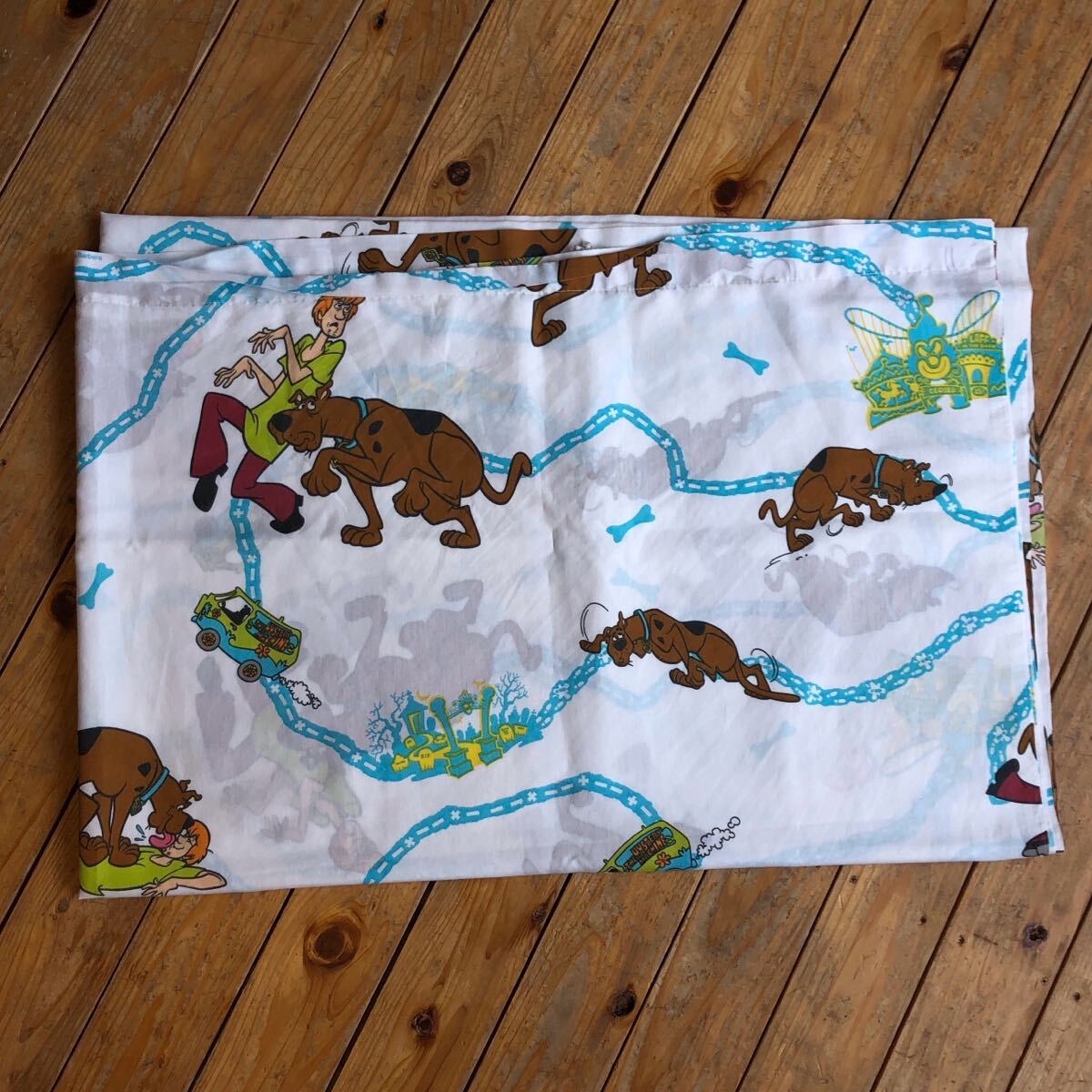 - USAヴィンテージ ベッドシーツ スクービードゥー リメイク生地 犬 キャラクター 総柄 素材 フラットシーツ アメリカ仕入 B2831