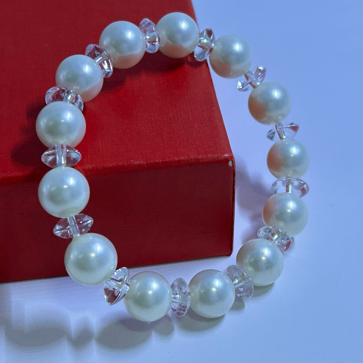 - 貝パール/ボタンカット水晶 ブレスレット貝パール約10mm玉/内径約15.5cm ブレスレット