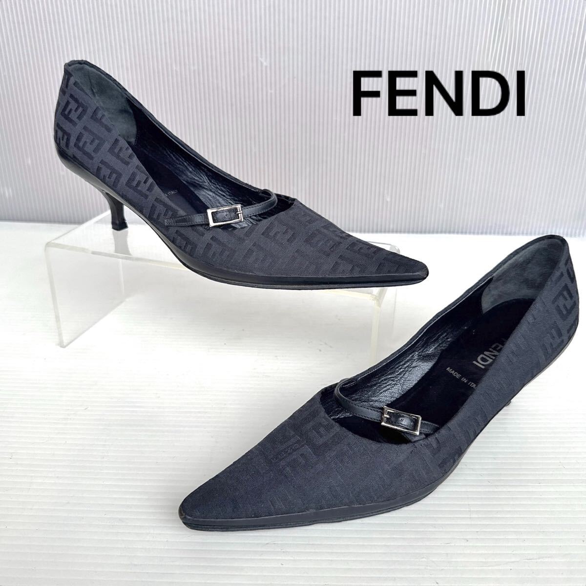 - FENDI フェンディ 定番 ズッカ FF総柄 ロゴ入り ポインテッドトゥ ローヒール パンプス レーディス シューズ 靴 ヴィンテージ ベルト装飾