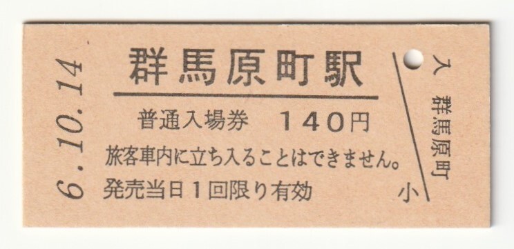 - 平成6年10月14日 吾妻線 群馬原町駅 140円硬券普通入場券(日付印刷)