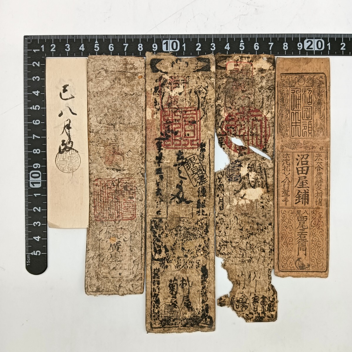- 【A3460】江戸〜明治時代 古札 藩札 私札 朱印 貨幣 古紙幣 古文書 骨董品 アンティーク 5枚まとめ