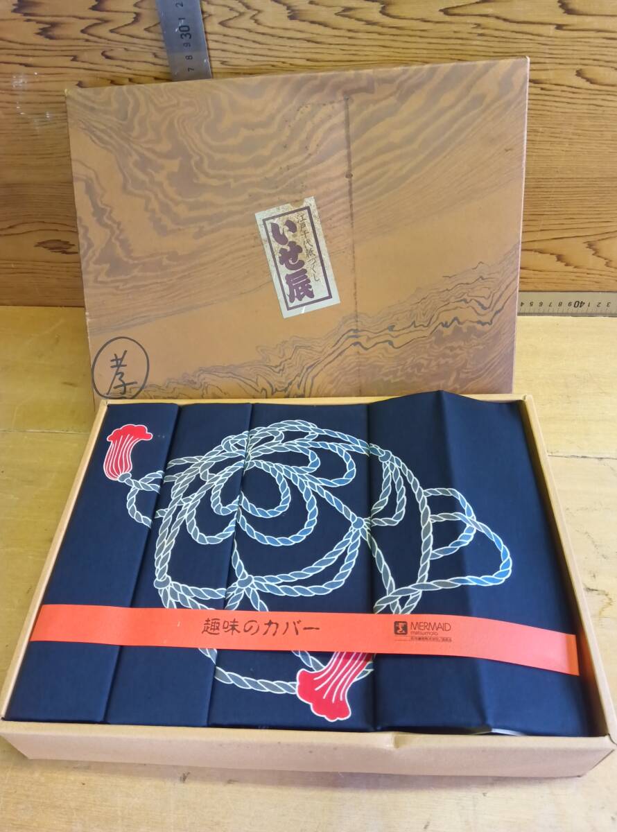 > 25061609 いせ辰 座布団カバーセット ひも結び柄 綿100% 江戸千代紙 歌舞伎十八番 隈取り 役者紋づくし 定引縞 未使用品