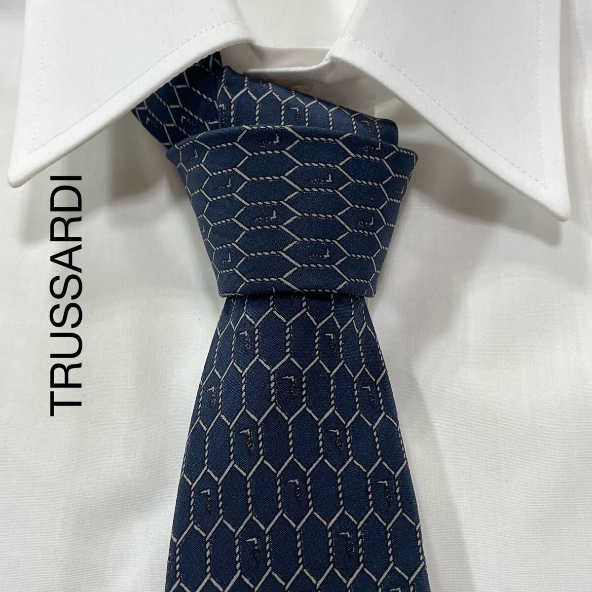 - TRUSSRDI トラサルディ ロゴ パターン柄 シルク ネクタイ イタリア製 ネイビー TG2403