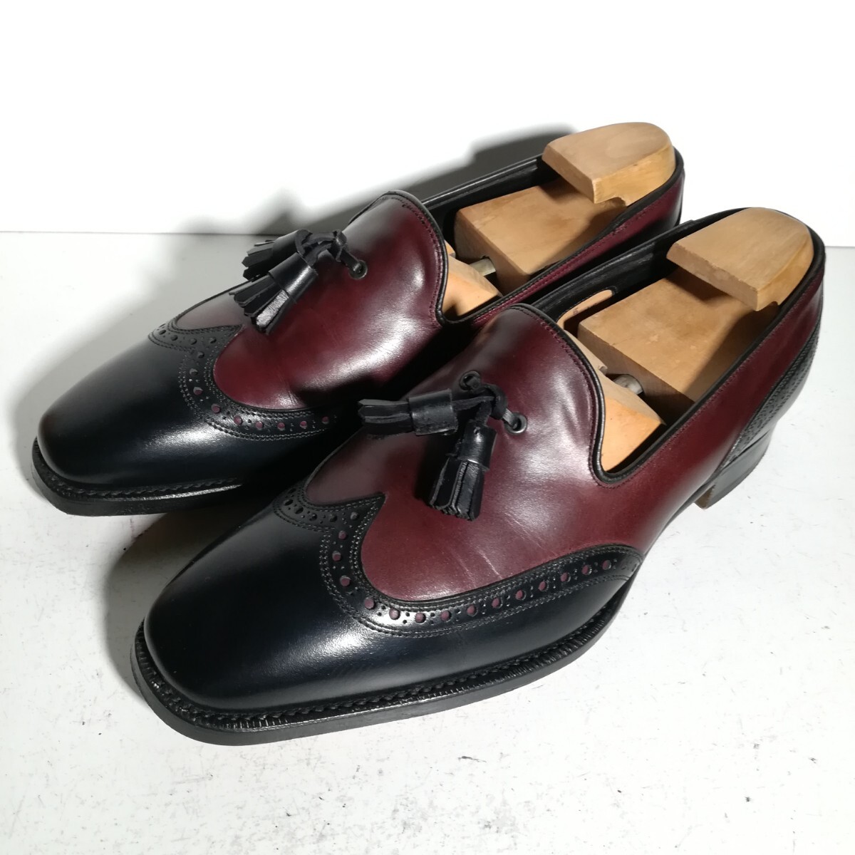 - c1016 左右サイズ違い 良品 ★ハロッズ Harrods★ 10298/F R1063 タッセルローファー 左8 右7.5 黒 × バーガンディ 革靴