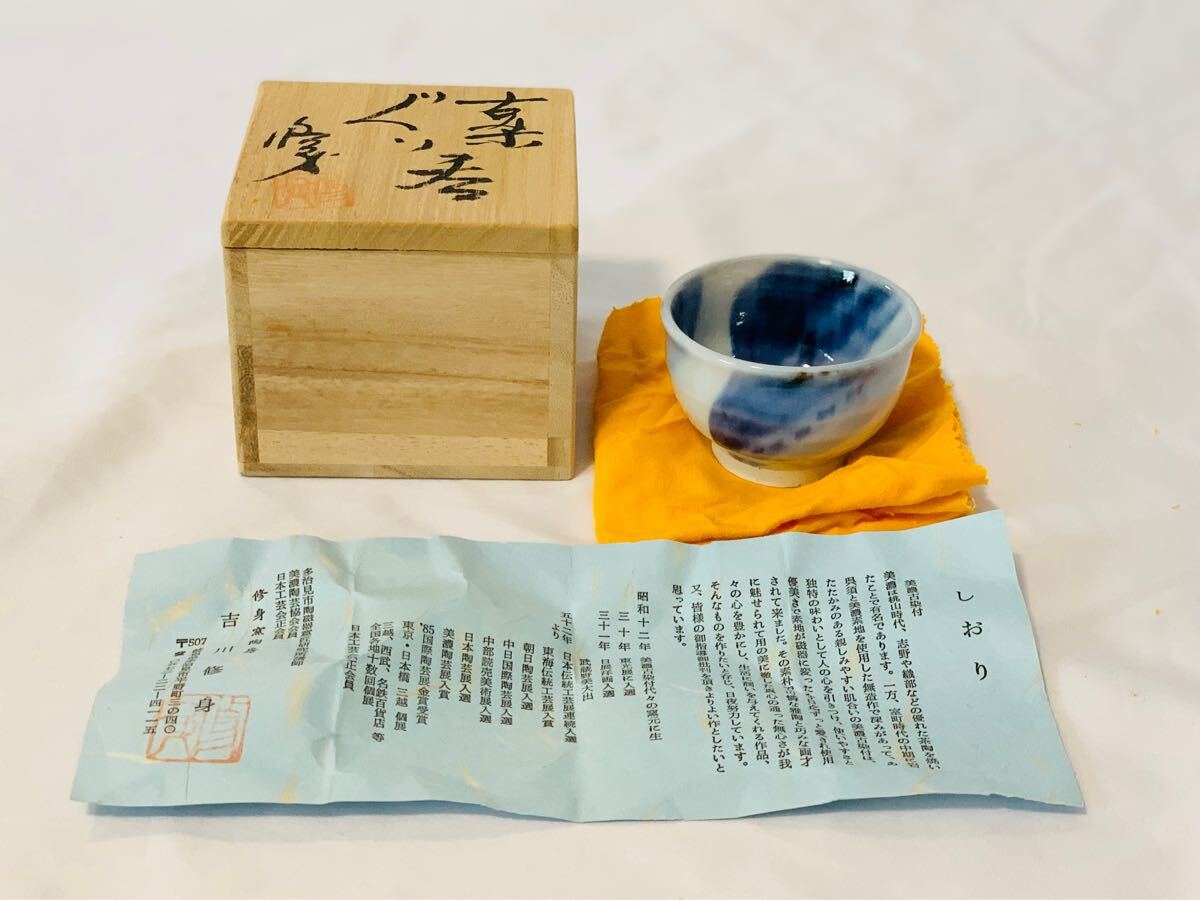 > 吉川修身 波 古染 ぐい呑 美濃 古染付 修身窯陶房 酒杯 盃 酒器 ぐい呑み 陶歴 書付 栞 共箱 共布 裏印 窯印 未使用