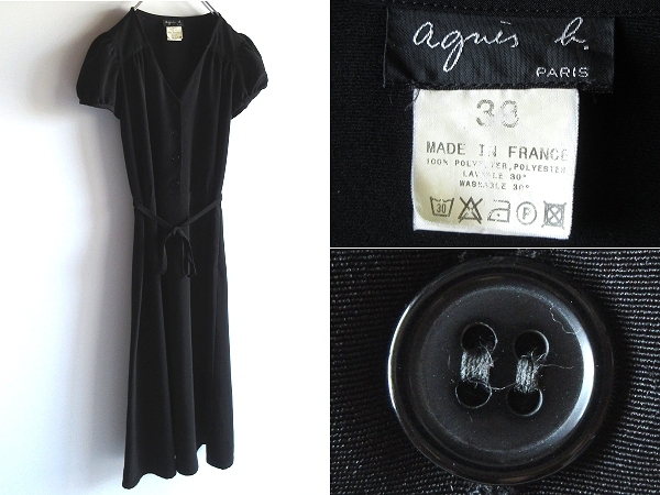 - 希少 フランス製 90sビンテージ agnes b. アニエスべー ウエストベルト紐付 ポリエステル パフスリーブ ワンピース 38 黒 ブラック