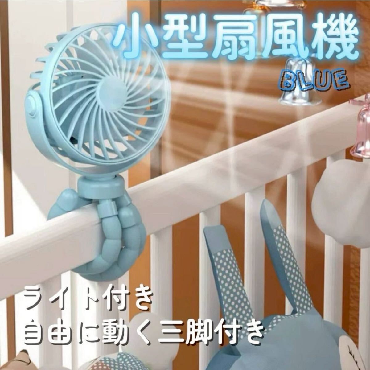 - 巻きつけ 小型扇風機 ベビーカー ライト付き スマホスタンド 吊り下げ ブルー