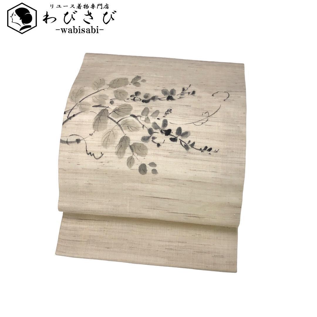 - 夏帯 名古屋帯 麻 手描き 墨描き 蔓葉模様 尾花色 O-5216 着物 きもの kimono 和服 和装 中古 リサイクル着物 【送料無料】
