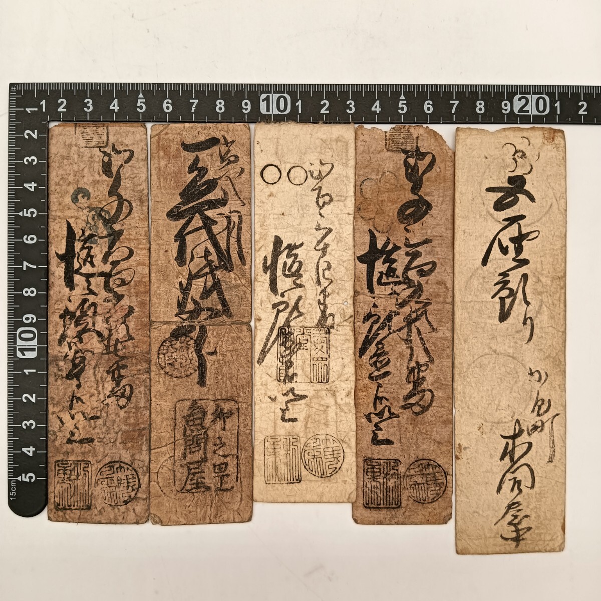 - 【A3533】江戸〜明治時代 古札 藩札 私札 朱印 貨幣 古紙幣 古文書 骨董品 アンティーク 5枚まとめ