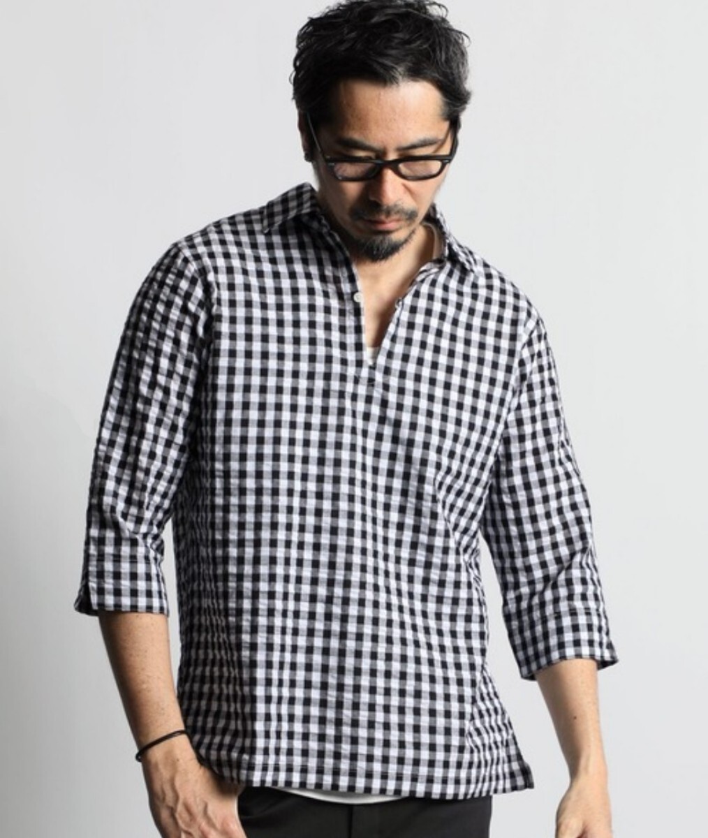 - The DUFFER of ST.GEORGE 3Q COTTON/LINEN NO COLLAR SHIRT:7分袖 コットン/リネンノーカラーシャツ【L】【Black】【2023-24/SS】
