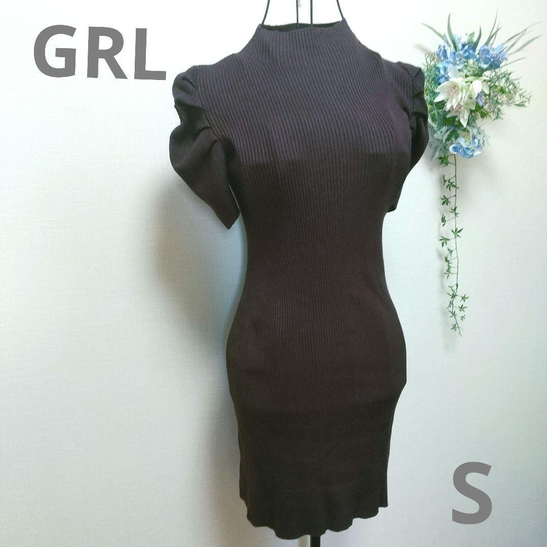 - ♪GRL ダークブラウン 半袖ニットワンピース S ミニ丈 デート 0048