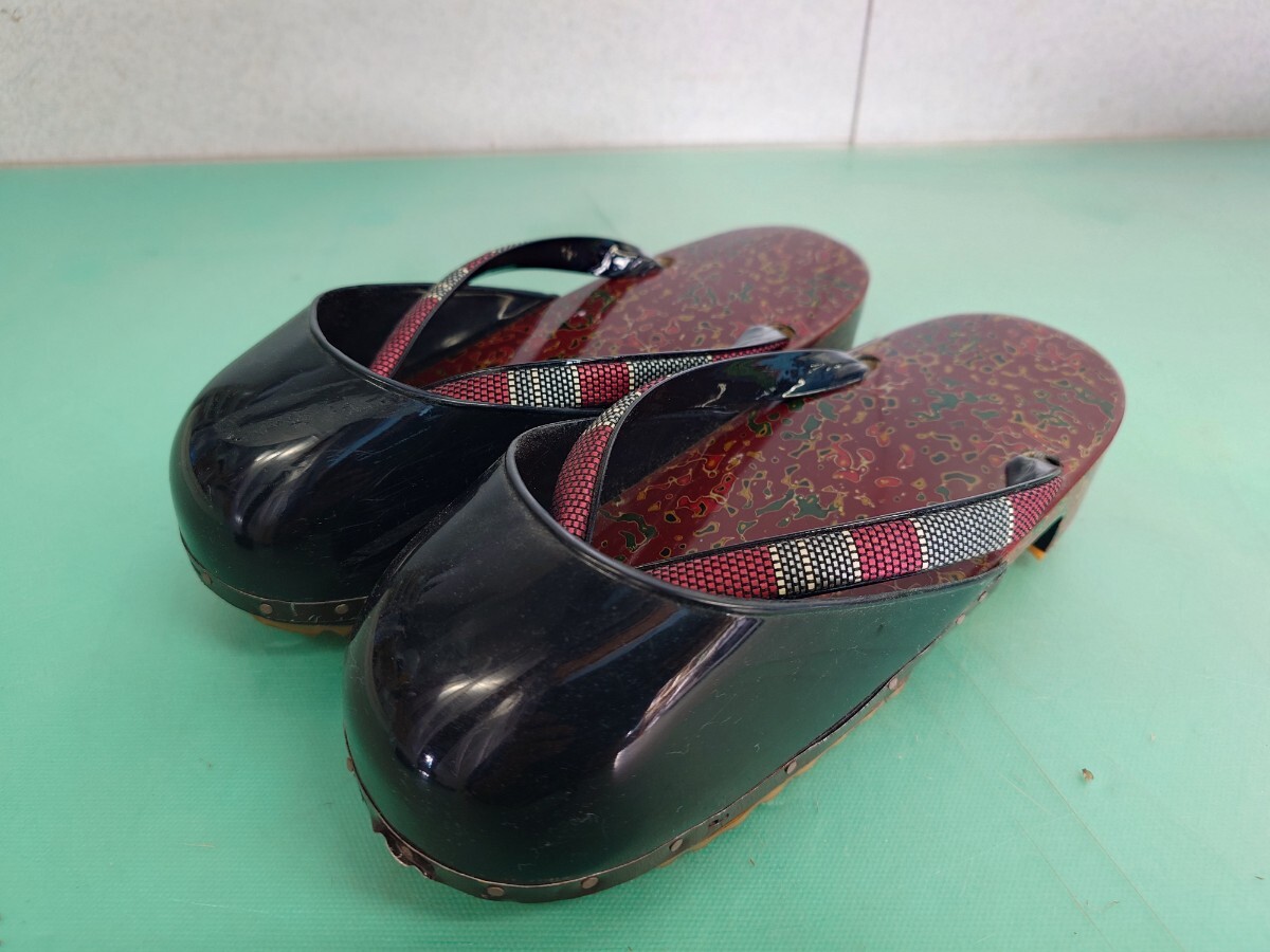 - ● 津軽塗 べに緒 防寒草履 寒草履 草履 唐塗 赤系 あずき色 ラメ入り/カバー 黒/鼻緒 スタイリッシュ赤×シルバー×黒糸 縁どり 中古 ③