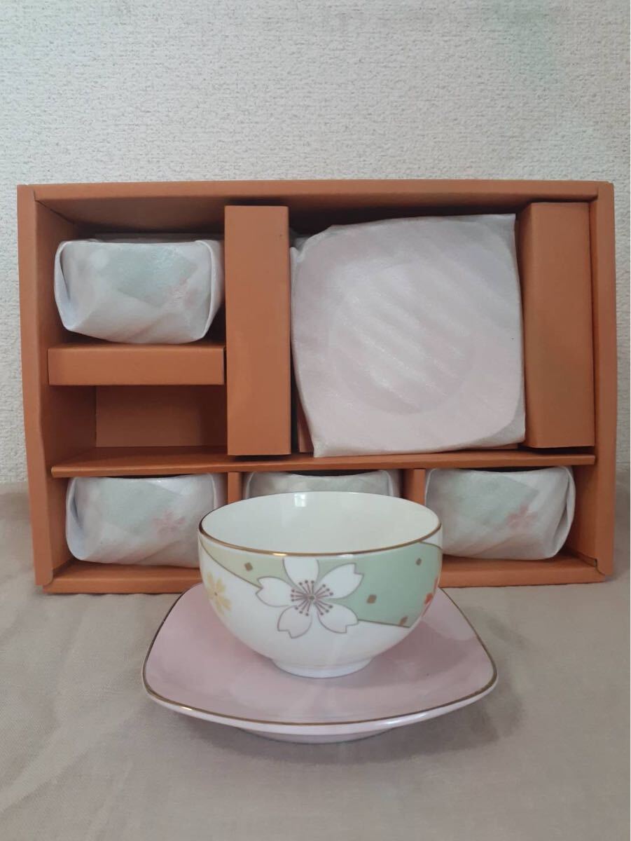- 新品未使用 陶器 湯呑みセット 湯呑み5個セット ピンク色 桜模様 花模様 茶托付き