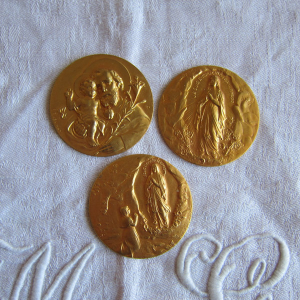 - 装飾メダイプレート36mm3個ルルド幼子キリスト聖ヨセフ聖母サイン作家 フランスアンティーク ヴィンテージ
