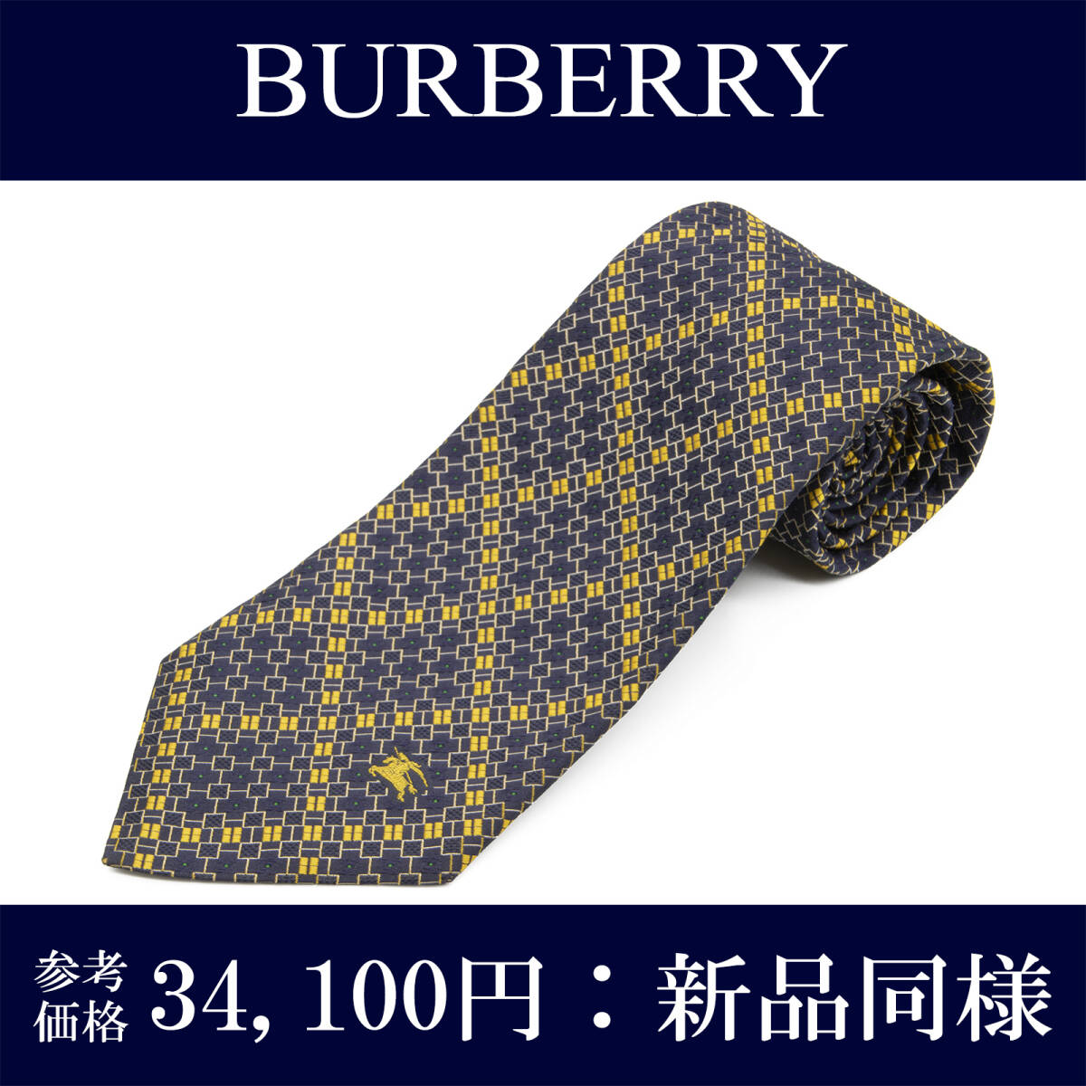 > 送料無料 バーバリー ネクタイ ジャガードタイ 新品同様 シルク 青 ネイビーブルー 黄色 緑 チェック 四角 ドット ホースロゴ マーク N819