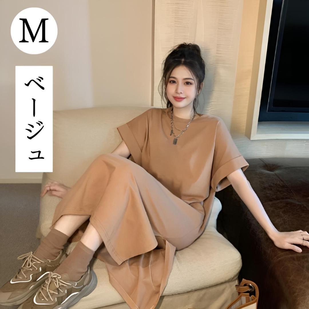- レディース 半袖 Tシャツ ワンピース 膝下 ロング ノースリーブ マタニティ ベージュ M