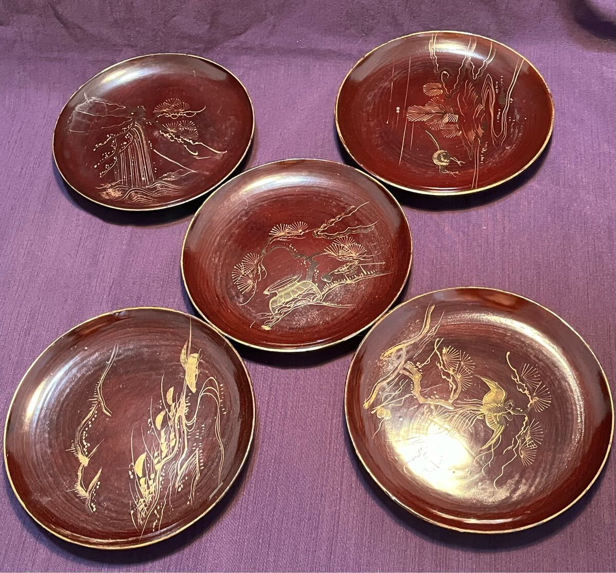 - 漆塗り金彩平皿五枚縁欠け有り[7910]