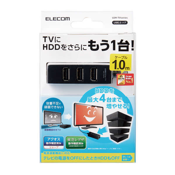 - USB2.0ハブ 4ポート 録画機能のあるテレビに接続することで、HDDを最大4台まで増やせる: U2H-TV003SBK