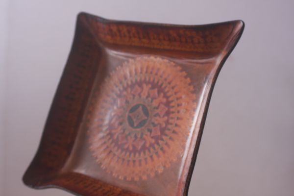 > 模様型押 革のトレイ 革製 ヌメ革 トレー 小物入れ サイズ:約20×20×H3㎝ 角に裂けあり/26N6.19-32
