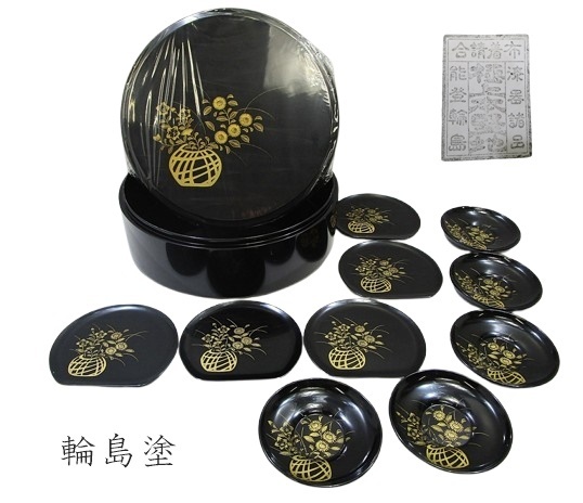 - 《ジャムルK》KKg0528-105◆輪島塗 上美品 沈金花草文 茶櫃 31cm 銘々皿 茶托 付き