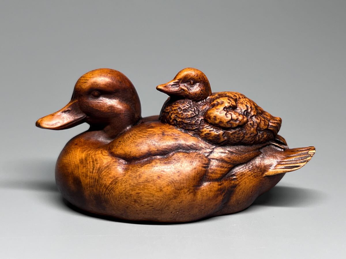 - 古美術 木製 黄楊木 鴨 親子 置物 飾り物 細工彫 コレクション 縁起物