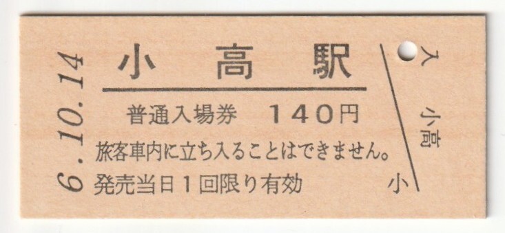 - 平成6年10月14日 常磐線 小高駅 140円硬券普通入場券(日付印刷)
