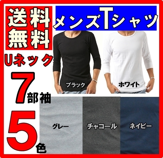 - 《メール便/送料無料》ベーシック 7分袖 メンズ Tシャツ Uネック 丸首 カットソー インナー 綿 UV対策 黒 白 ネイビー グレー