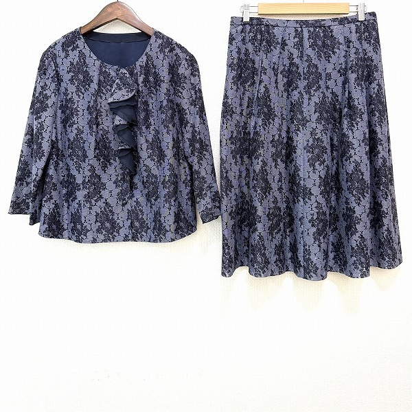 - #anc レリアン Leilian セットアップ 13+ 紺系 ツーピース カットワーク フリル 花柄 薄手 七分袖 大きいサイズ レディース [955404]