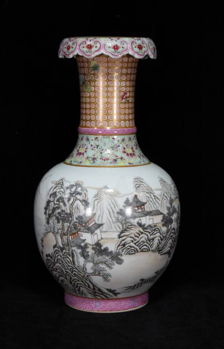 > 【仁】『清・乾隆年製款・古陶瓷品・墨彩・描金・山水紋・花口瓶・陶藝』極細工 古董品 中国古玩 古美術 古美味 時代物 旧家蔵出