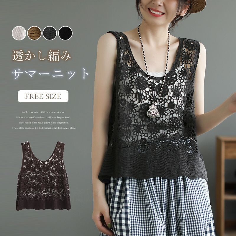 - ベスト ニットベスト レディース サマーニット 春 夏 トップス 涼やか 透かし編み カーディガン カジュアル レイヤード クロシェ
