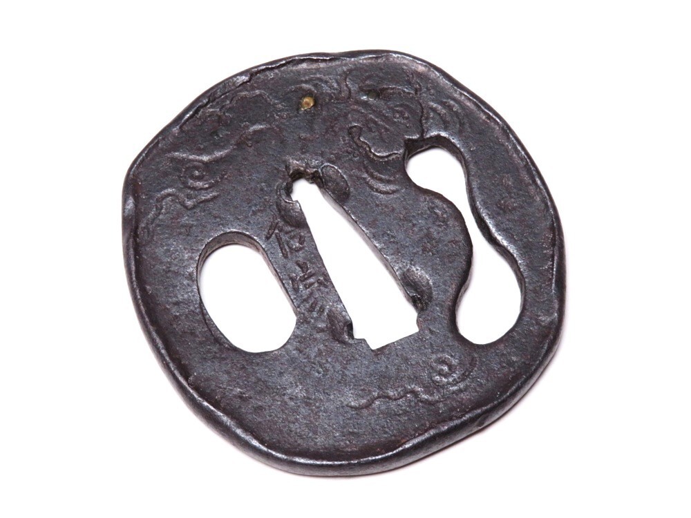 - 【10722】刀装具 (検/甲冑/刀/縁頭) 鉄地 在銘 信家 瓢箪透かし 鍔(初品・買取品)