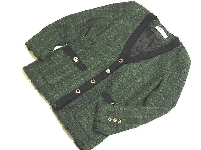 > 新品同様 D16 ZARA ザラ レディース ツイード カーディガン風 ジャケット ◆ S グリーン×ブラック 上着 アウター ノーカラー ▼7G
