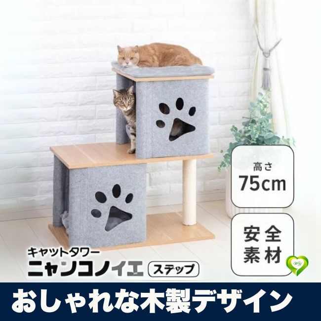 - 【おしゃれな木製デザイン】キャットタワー 階段型 据え置き 隠れ家2室 シニア猫向け 人気 おすすめ
