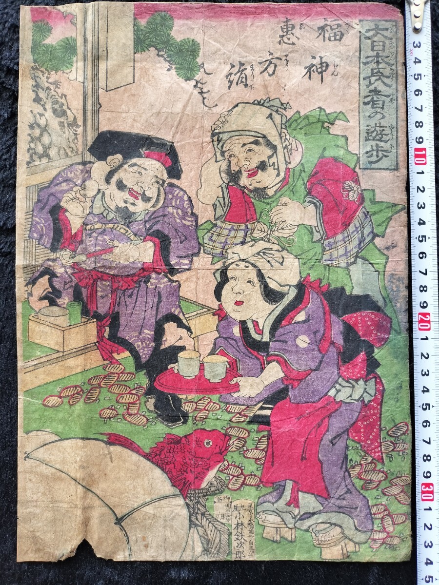 - 明治期/真作「大日本長者の遊歩」七福神 本物浮世絵木版画 風俗絵 錦絵 大判 裏打ち