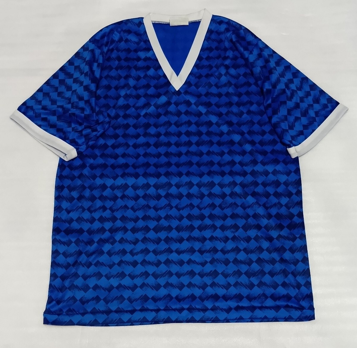 - □四角総柄 TEE サイズL Vネック半袖Tシャツ 軽量伸縮機能ストレッチ青色ブルー黒ブラック縁ホワイト白スポーツ洗濯済ティー肩幅約45身幅53