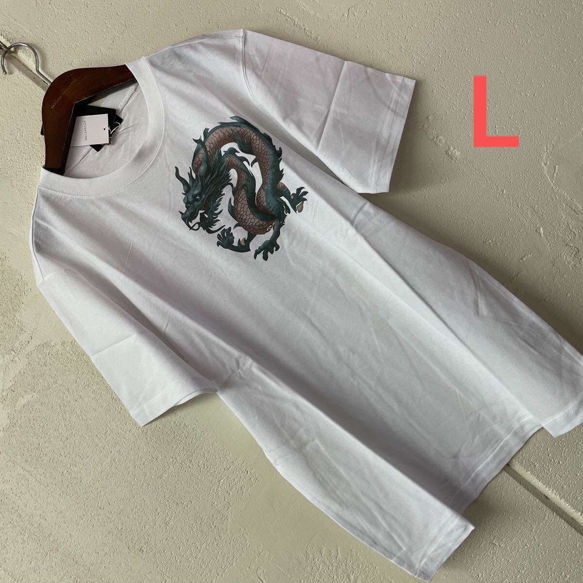 - Lサイズメンズ綿100%和柄プリント半袖Tシャツ白龍