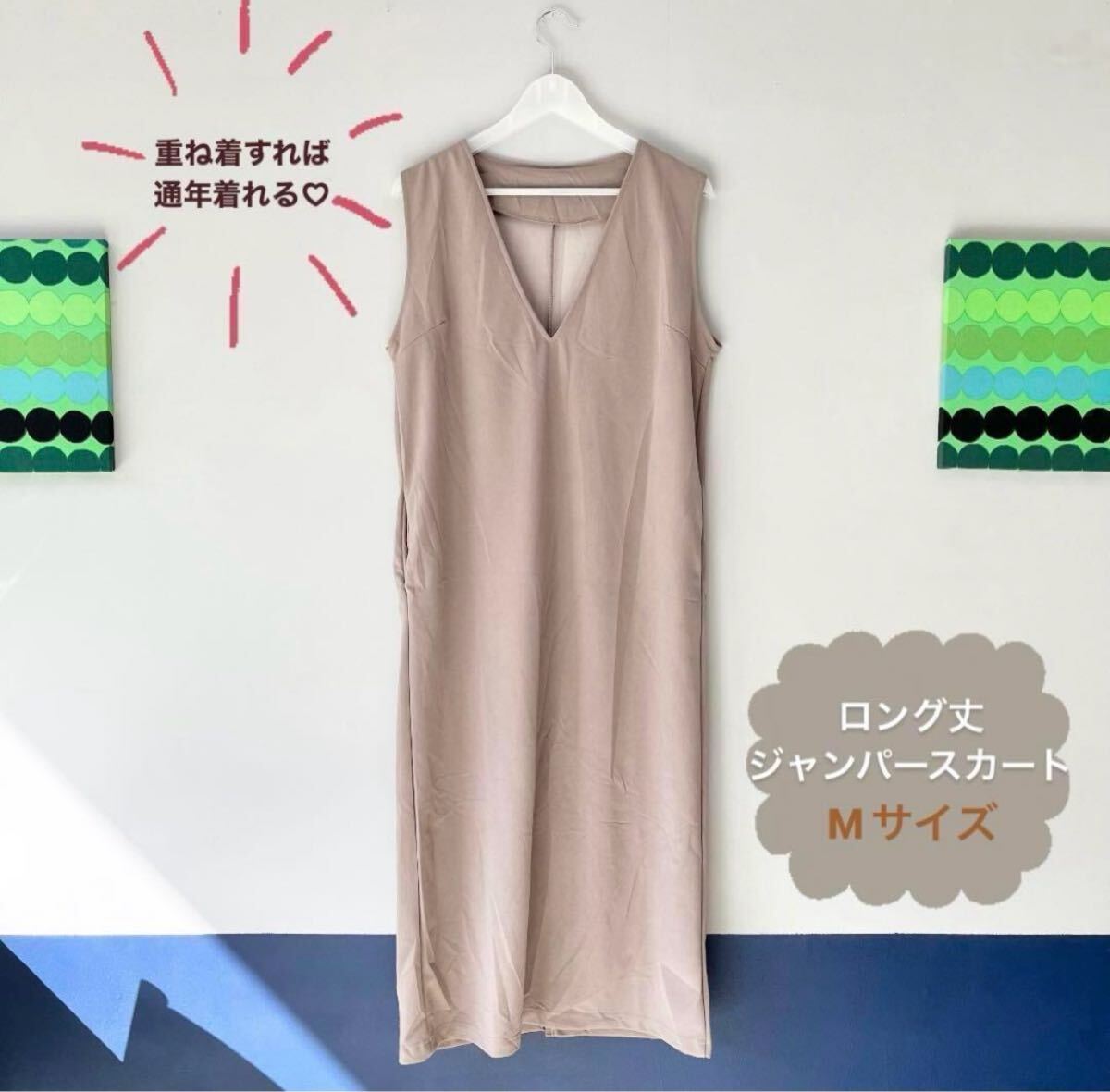 - ロング丈 ジャンパースカート Vネック ワンピース Mサイズ モカブラウン