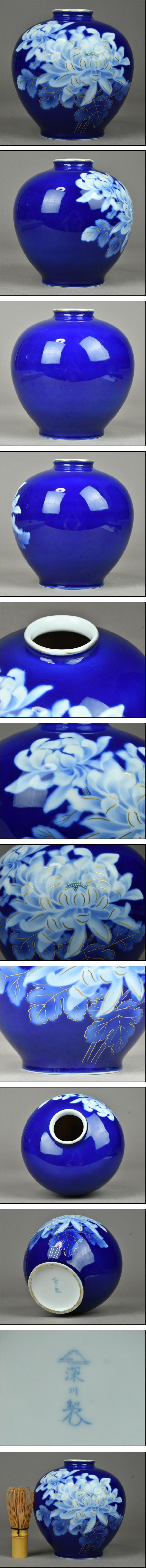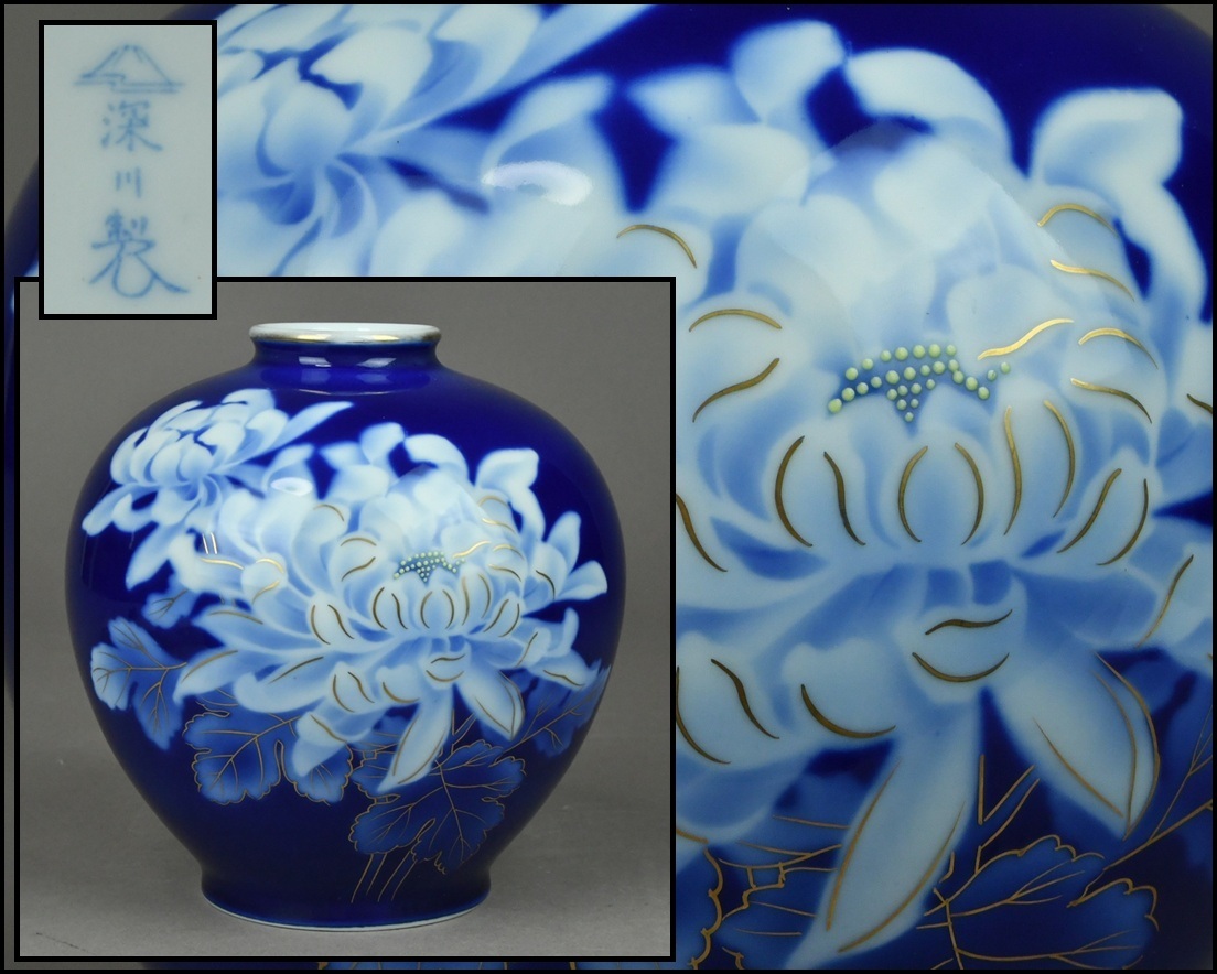 - 【ACT】有田焼【深川製】金彩 染付 牡丹図 花瓶 飾壷 美術品 A7-717B
