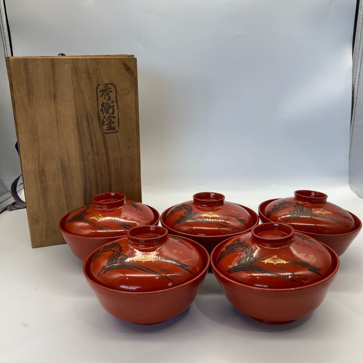- M0721704B 秀衡塗 秀衡椀 汁椀揃 汁椀 吸物椀 5個 御器 和食器 工芸美術 伝統工芸 工芸品 当時物 中古品 現状品